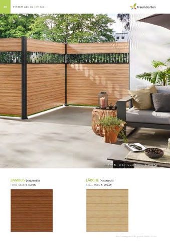 36 SYSTEM ALU XL | METALL SYSTEM ALU XL Lärche mit Dekorprofil OMEGA BAMBUS (Naturoptik) LÄRCHE (Naturoptik) T3923 Stück € 599,00 T3921 Stück € 599,00 Alle Preisangaben inkl. gesetzl. MwSt. in Euro.